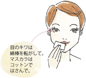 クレンジングオイルを含ませたコットンをまぶたや唇にのせ、軽くすべらせるようにしてメイクをオフ。