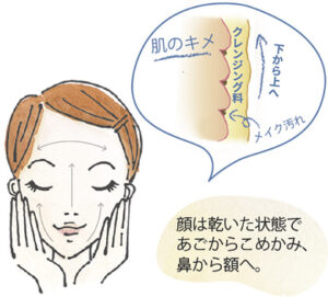 キメの溝に入り込んだメイクとクレンジング料をなじませるため、下から上へ向かって顔全体にのばします。