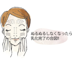 32℃のぬるま湯を少量手に取り、指の腹で肌にやさしくらせんを描くようにクレンジング料となじませます。これを数回繰り返すとクレンジング料が白く濁ります。これが「乳化」です。