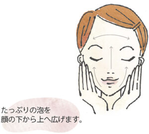 手を洗い、顔をぬらした状態ではじめます。ぬれた手で洗顔料をよく泡立て、メレンゲのような弾力のある泡をたっぷりとつくります。