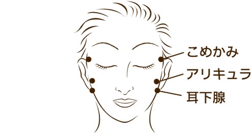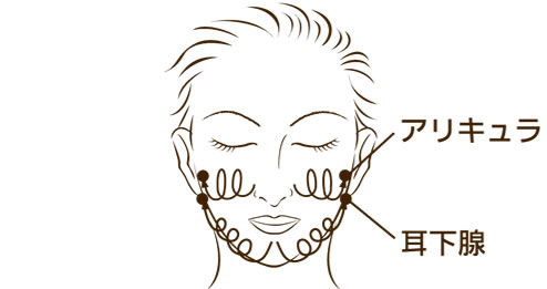 耳下腺・アリキュラ・こめかみをプッシュ。