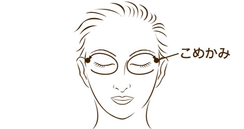 中指と薬指の腹で、まぶた全体をやさしくなで、こめかみをプッシュ。(3回)