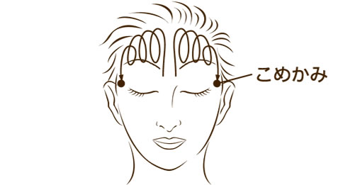 指の腹全体で額に大きくらせんを描き、こめかみをプッシュ。(3回)