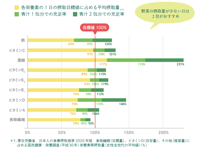 普段の食生活で不足しがちな鉄・食物繊維・ビタミンDなどに加え、女性が意識して摂りたいビタミンCや葉酸など必要な栄養素を1杯にギュッと濃縮。