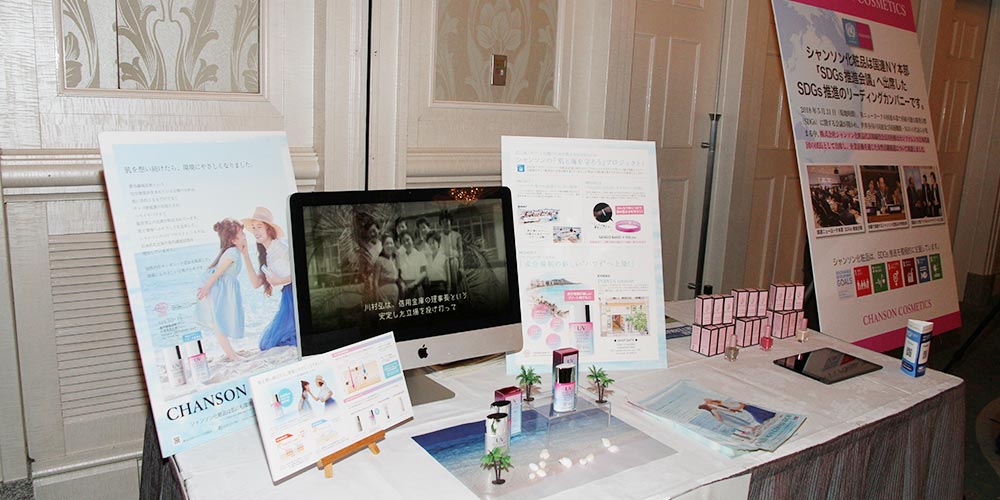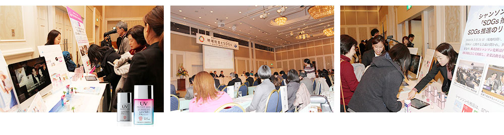 シンポジウムには、市内外から高校生や大学生を含む幅広い世代の方々およそ250人が参加し、SDGsに関して活発な意見交換が行われました。また会場では13の企業・団体がブースを出展。シャンソン化粧品のブースでは、「肌と海を守ろう」プロジェクトを始めとするSDGsへの取り組みをご紹介しました。