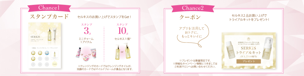 新発売の「セルキス」2品(セルキス クレンジングオイル/セルキス マイルドフォーム)をセットで購入する際にご利用いただけるクーポンです。旅行にも便利なトライアルキット(¥1,700相当)をプレゼントいたします。