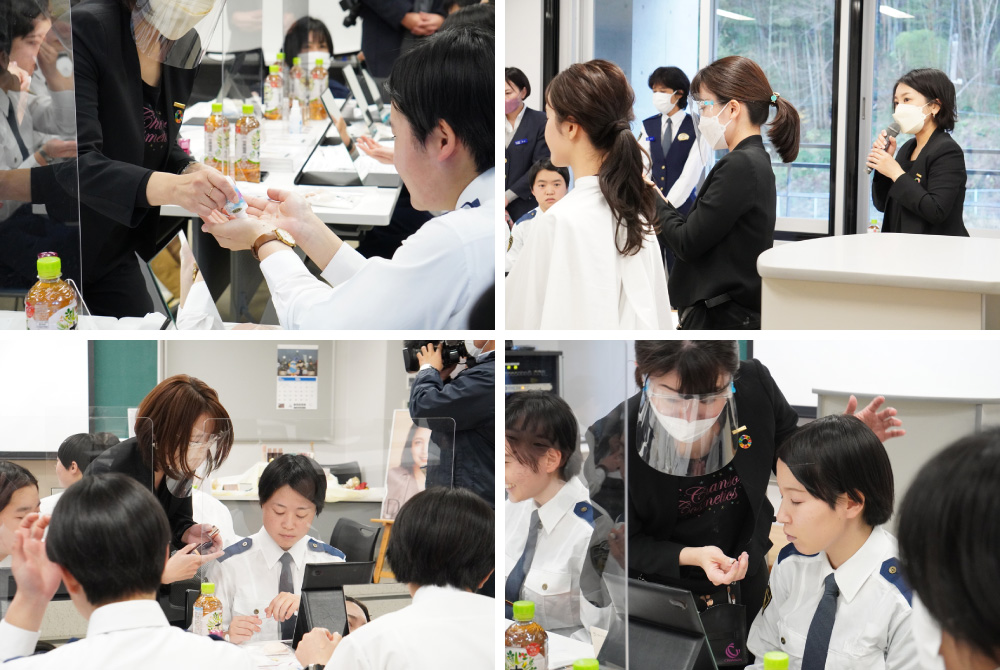 警察官は地域の方々と接する機会の多い職業です。親しみやすい印象を与えるための「身だしなみ」をテーマに、デモンストレーション・実習を交えて紹介しました。講師はシャンソン化粧品の美容インストラクター3名と交通巡視員としての実務経験があるシャンソン化粧品特約店のオーナーが務めました。卒業を間近に控えた17名が参加し、メイク実習にも真剣に取り組む様子が伺えました。