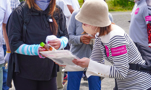 シャンソン化粧品の日焼け止めはすべて、サンゴ礁破壊の一因とされる紫外線吸収剤を使用しておらず、肌にも環境にもやさしい日焼け止めとして、国内外で多くの皆様にご愛用いただいております。今回、ビーチクリーン参加者には、このUVプロテクトシリーズのミニチュアをプレゼントさせていただき、肌と環境にやさしい化粧品を選ぶ大切さをお伝えさせていただきました。
