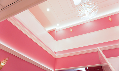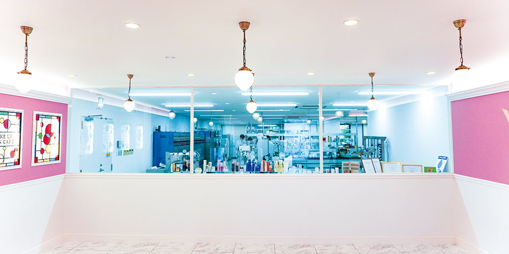 エントランスをはじめとする研究所の内装は、「新たな美を生み出し、女性がさらに美しく、より明るい未来を発見できる場所」をイメージしてデザイン。華やかなピンクの壁紙や、煌びやかなシャンデリアなど、従来の研究所のイメージを払拭する唯一無二の空間となっています。