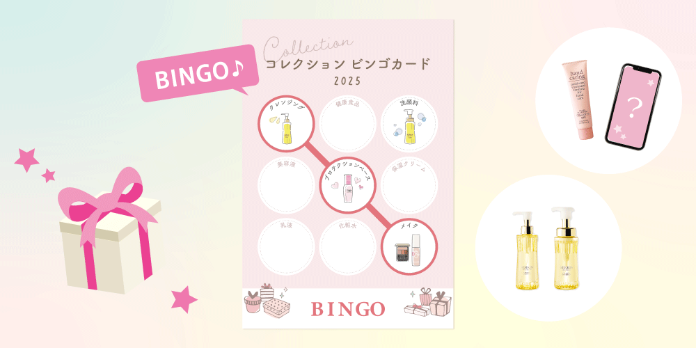 シャンソン公式アプリに、クレンジング、洗顔料、化粧水、美容液、乳液、保湿クリーム、プロテクションベース、メイク、健康食品の9種類のスタンプを集めるビンゴカードが新登場します!