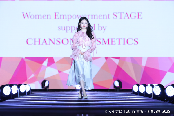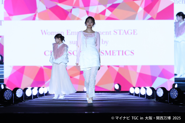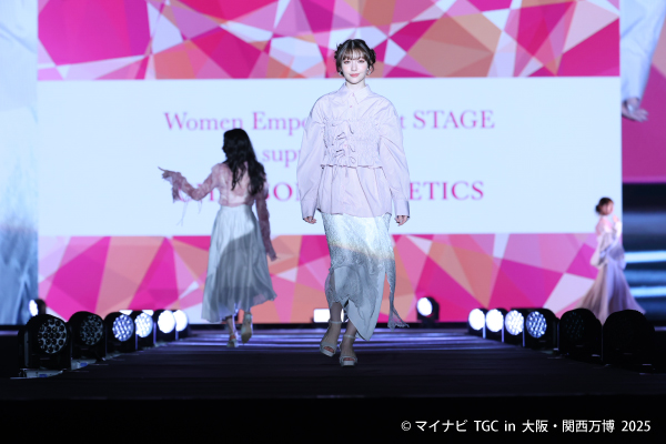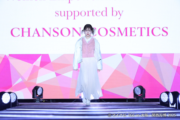 シャンソン化粧品協力の「WOMEN EMPOWERMENT STAGE supported by CHANSON COSMETICS」では、SNSの総フォロワー数が500万人を超えるなど、ティーン世代にカリスマ的人気を誇るMINAMIさんをはじめ、入江美沙希さん、加藤栞さん、雑賀サクラさんが登場し、注目を集めました。大阪・関西万博のテーマ「いのち輝く未来社会のデザイン」に基づき、個性や多様性を尊重したメイクで、モデルたちの魅力を引き立てる華やかなランウェイとなりました。