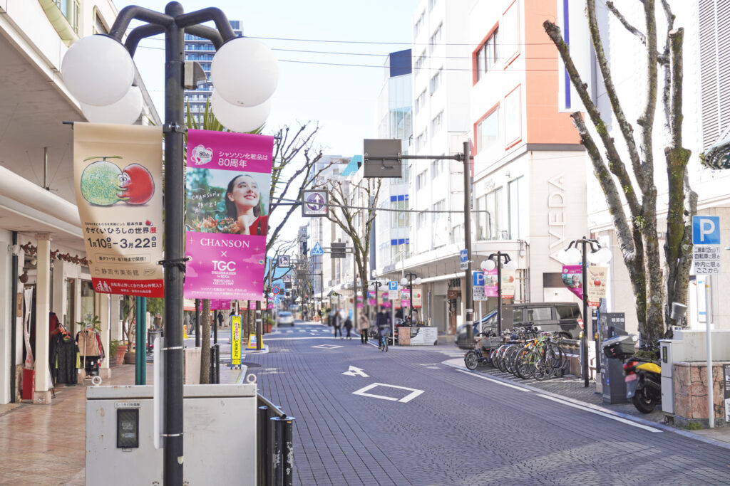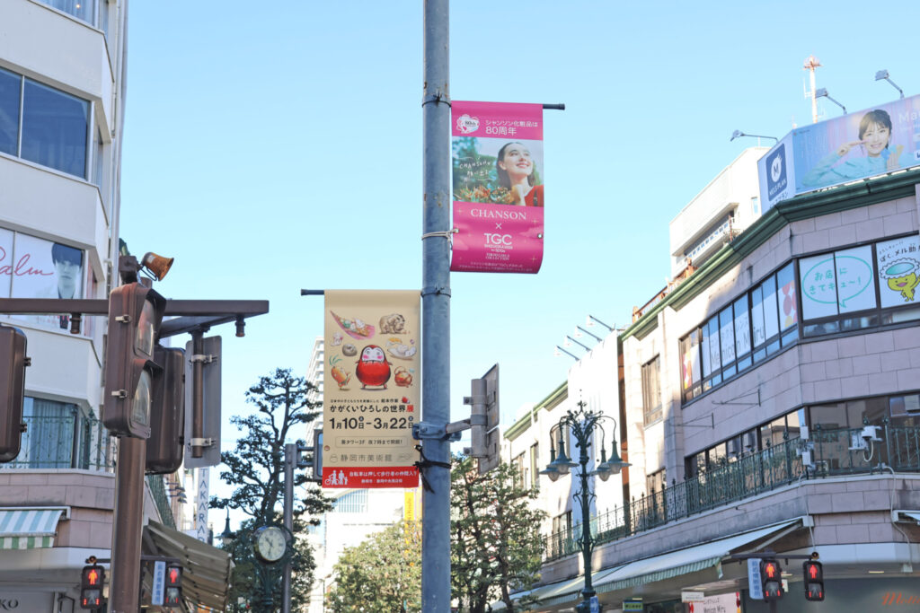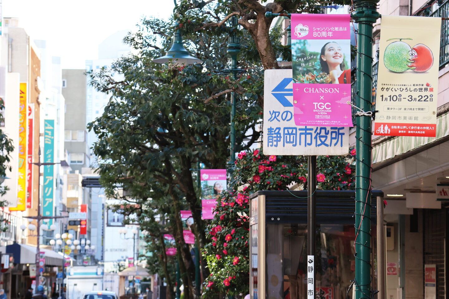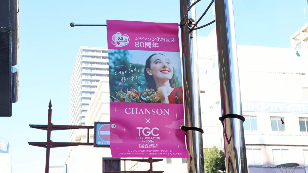 イベントの開催を目前に控え、静岡市のメインストリートである呉服町通り・七間町通りには、シャンソン化粧品のシンボルカラーであるピンクのフラッグが掲げられ、街全体が華やかな雰囲気に包まれています。このプロモーションは、地域の皆さまとともに「TGCしずおか」を盛り上げる取り組みとして、2026年1月12日(月)まで実施いたします。