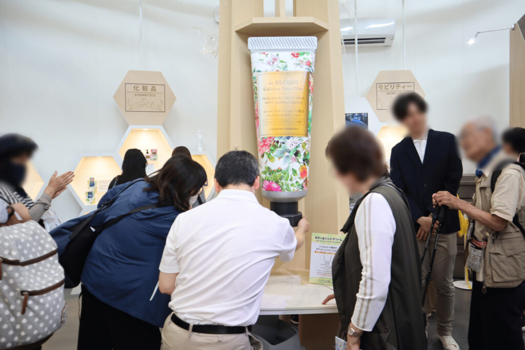 2025年6月、シャンソン化粧品は大阪・関西万博で、セルロースナノファイバーを配合したボディミルク入りの巨大チューブを展示しました。展示エリアには1日あたり約12,000人が来場し、ブースには連日多くの方が足を運びました。来場者は実際にボディミルクに触れ、香りのここちよさやベタつかない使い心地に感心する様子を見せるとともに、発売を楽しみにする声も多数寄せられ、ブースは終日大盛況となりました。
