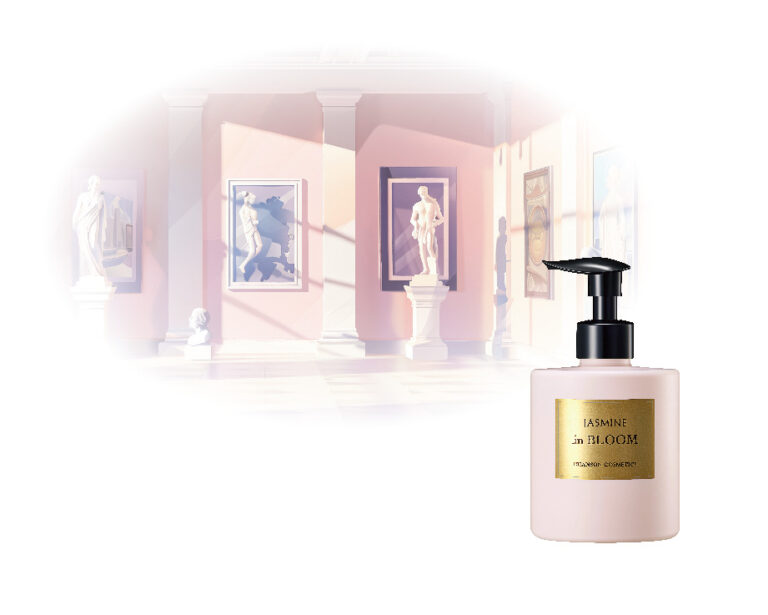 ブランド名 「in bloom(花々が咲き誇る様子)」 を象徴する、華やかで上質なパッケージ。香りと使い心地の特別感を演出します。