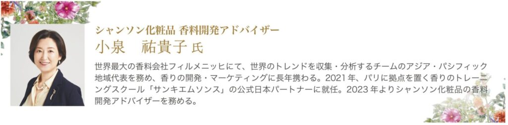 香りは、シャンソン化粧品の香料開発アドバイザー 小泉氏が監修。フレグランス品質の香料を贅沢に使用し、日常に華やかさとここちよい余韻を添えます。
