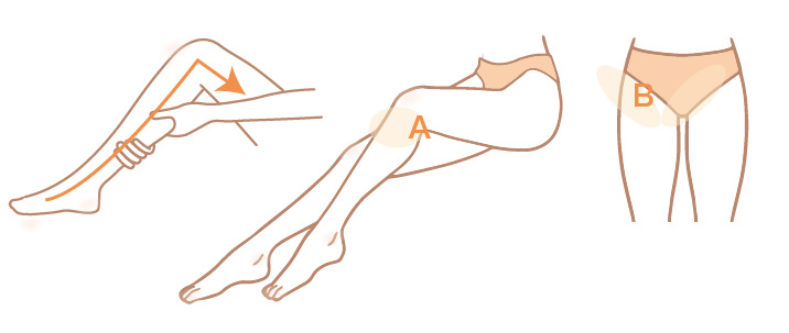 - 脚のつけ根のリンパ節(B)をもみほぐす。