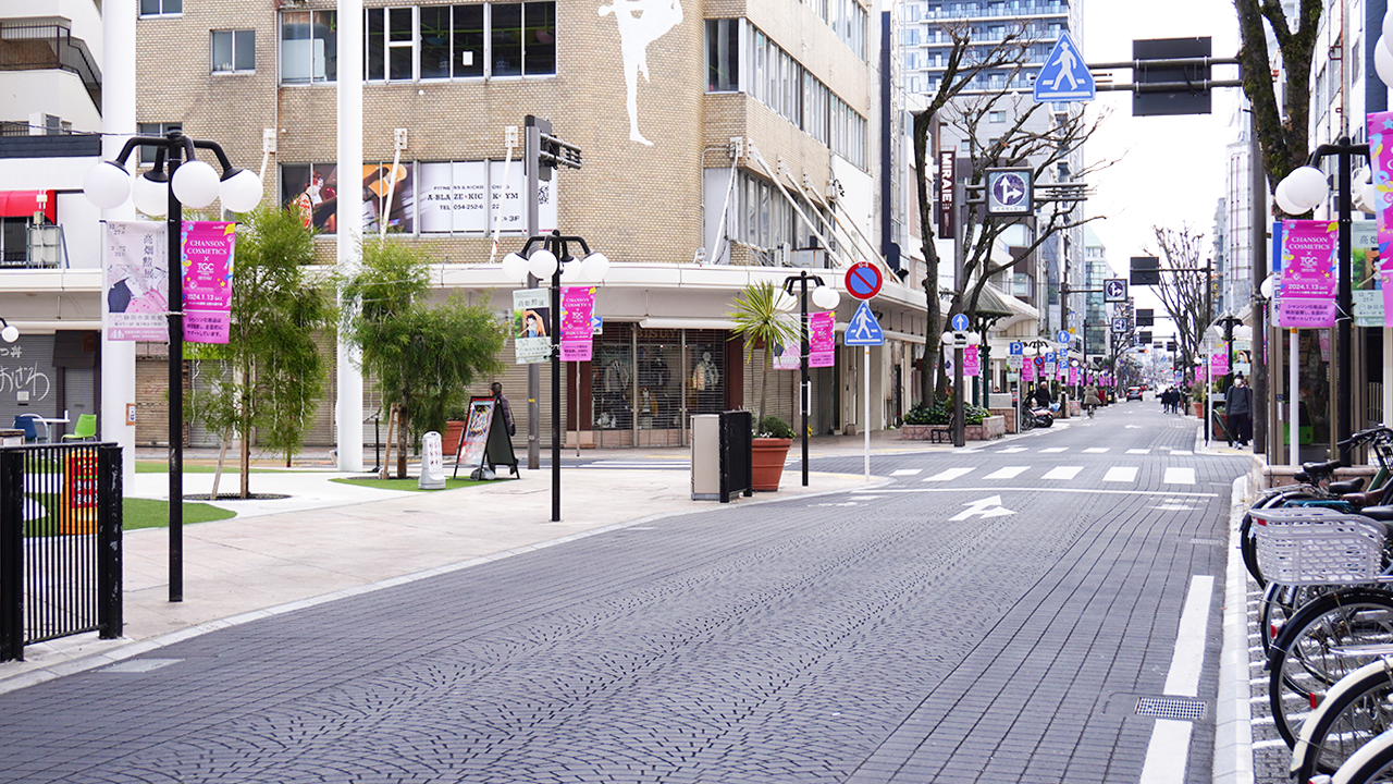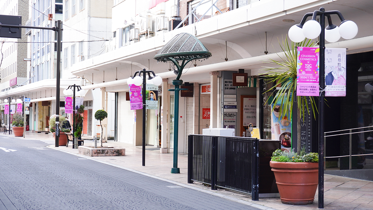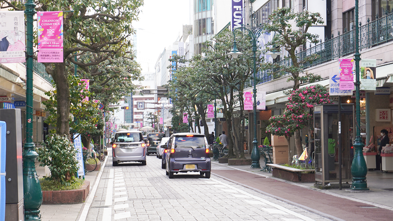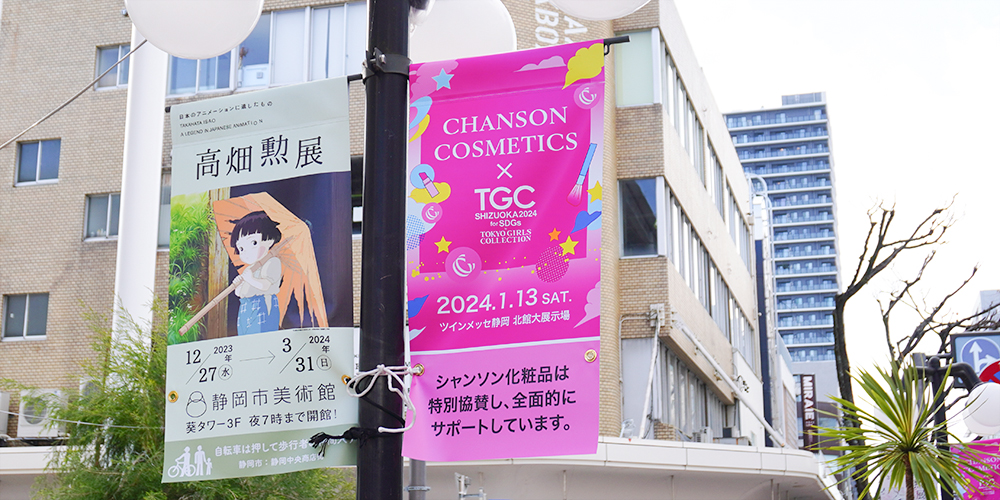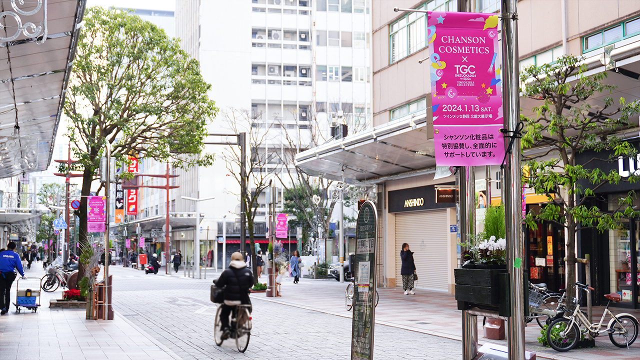 SDGs推進 TGC しずおか 2024 開催を間近に控え、シャンソン化粧品ではこのイベントをさらに盛り上げるため、今年も静岡市のメインストリートである呉服町通り、七間町通りにフラッグを掲げ、1月14日(日)までシャンソンのピンク色で街を彩ります。