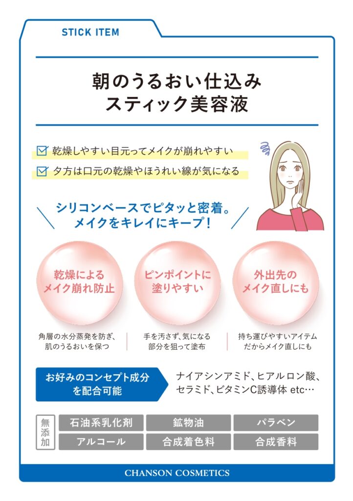 そんな肌こそ、朝のうるおい仕込みが大切。このスティック美容液は、試作を重ねた末にたどり着いた「シリコンベース」処方です。