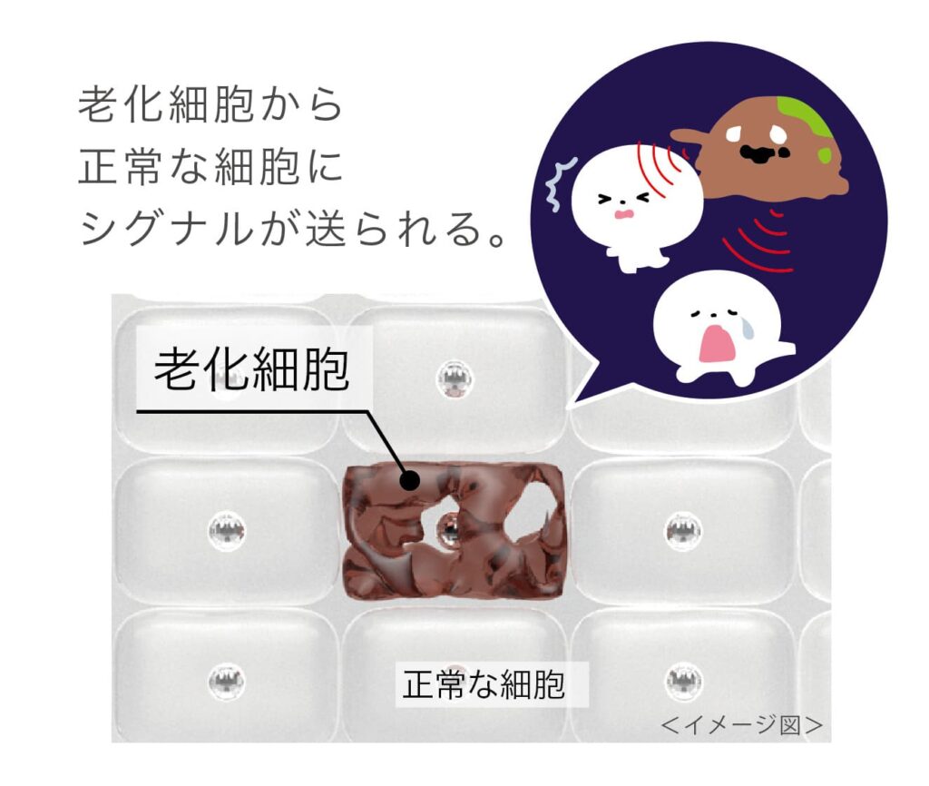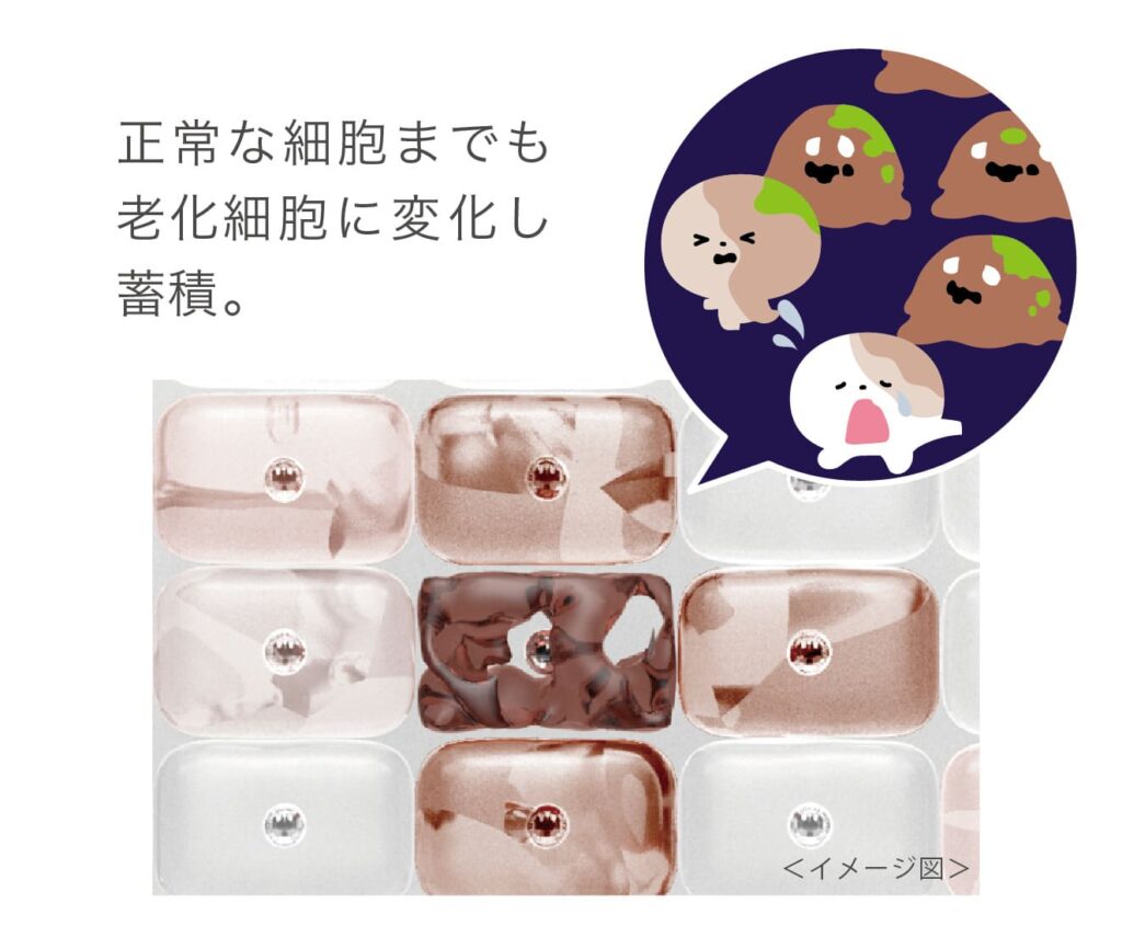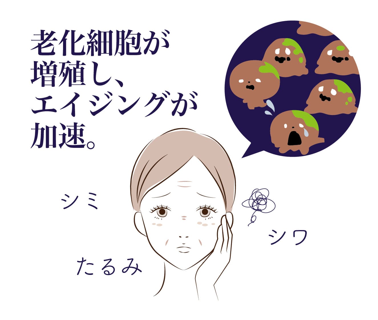 シミ、シワ、たるみなど、あらゆるエイジングを加速させる「老化細胞」は、加齢とともに増加し、肌年齢を左右する重要な要因です。さらに、周囲の正常な細胞をも老化細胞化させることから、別名「ゾンビ細胞」と呼ばれています。
