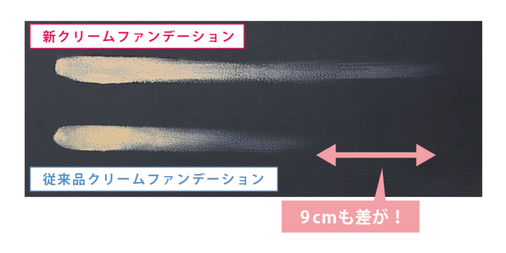 人工皮革に同量のファンデーションをのせ、同じ力でのばすと…