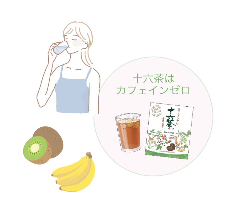 こまめな水分補給は、血液の循環を促進し、老廃物の排出につながります。ただし、 コーヒーなどカフェインの多い飲み物の摂りすぎは要注意。 水やカフェインゼロのお茶もバランス良く摂りましょう。 また過剰な塩分を排出する効果があるカリウムの多い食材もおすすめ。キウイやバナナなどのフルーツを食後のデザートにプラス!