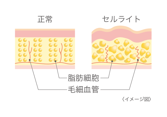 皮膚の下に脂肪が蓄積され、ぼこぼこした状態に見えてしまう「セルライト」。実はむくみにより血流が悪い状態が続くと、余分な水分や老廃物が脂肪細胞に蓄積され、セルライトの原因に。むくみは放っておかず、しっかりケアすることが美ボディへの鍵!
