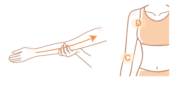 - 肘の内側のリンパ節(C)をもみほぐす。