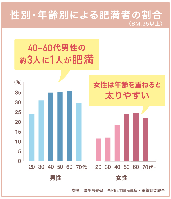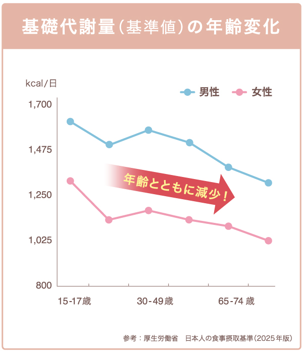 10代から20代をピークに基礎代謝は低下し、消費するエネルギーは減っていきます。さらに、不規則な生活や運動不足が続くと、基礎代謝はより一層低下。消費しきれなかったカロリーが脂肪として蓄えられていきます。
