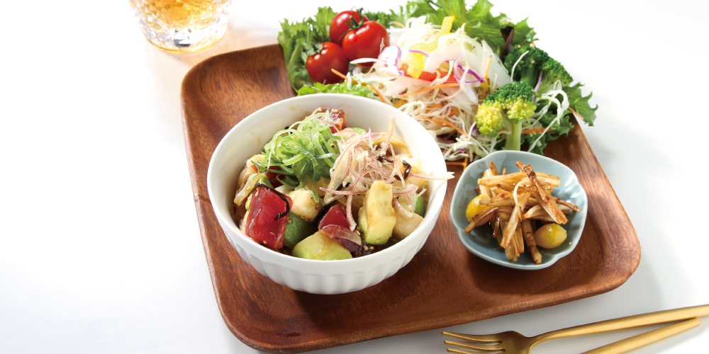 - ボウルでBを混ぜ、まぐろとアボカド、長芋を加えて和える。