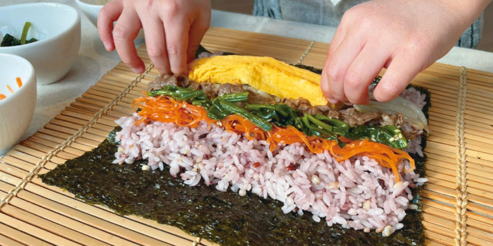 - Aを手前から3/4程度まで均一にのせ、中央に具材をのせたら手前から一気に巻く。