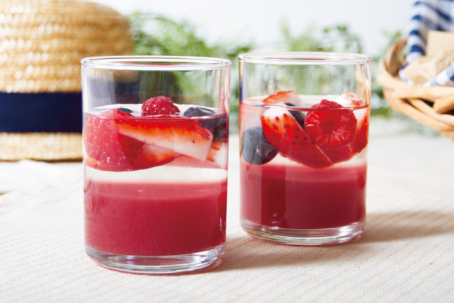 - 2のゼリー液を半量ずつに分け、片方にピュアベリーを入れて溶かす。