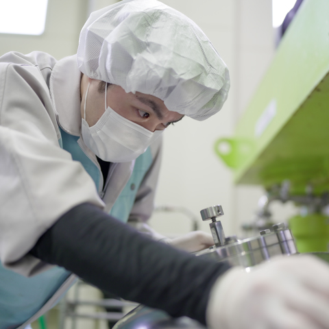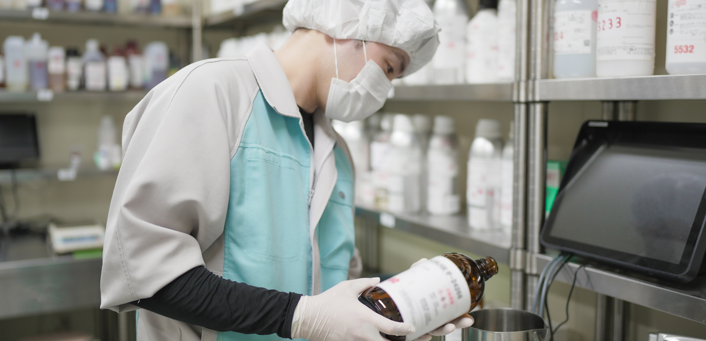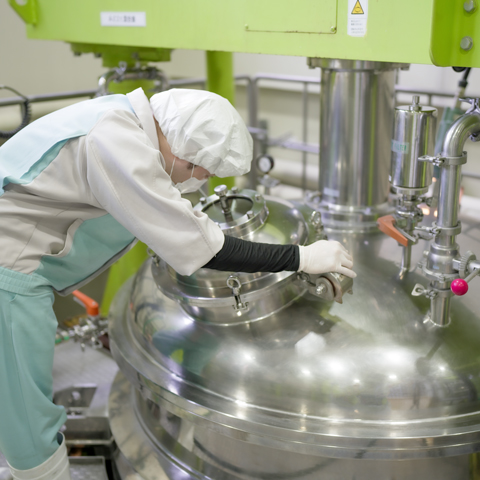 私が所属している生産部製造課は、化粧品の中身を作る工程を担当しています。化粧品は「釜」と呼ばれる機械を使って調合するため、これを扱う技術だけでなく、日々のメンテナンスも重要な業務となります。釜の状態を常に確認し、適切な調整を行うことで、品質を保つことが求められます。