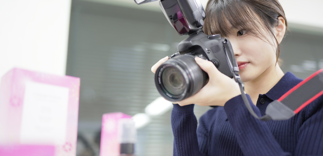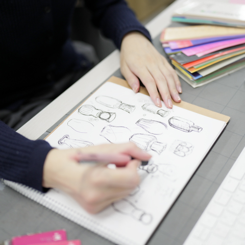 デザイン課では、化粧品・健康食品・宝飾品など、シャンソンが取り扱っているさまざまなセクションのデザインを担当しています。容器や箱のデザインだけでなく、ポスターやパンフレットなどの販促物制作、ディスプレイや展示ブースのデザインに至るまで、仕事は多岐にわたります。さらに、シャンソンVマジック(女子バスケットボールチーム)の試合撮影も担当する機会があります。幅広い業務を担当させてもらう中で、日々新しい経験や出会いを楽しみながら、デザインの可能性を追求しています。