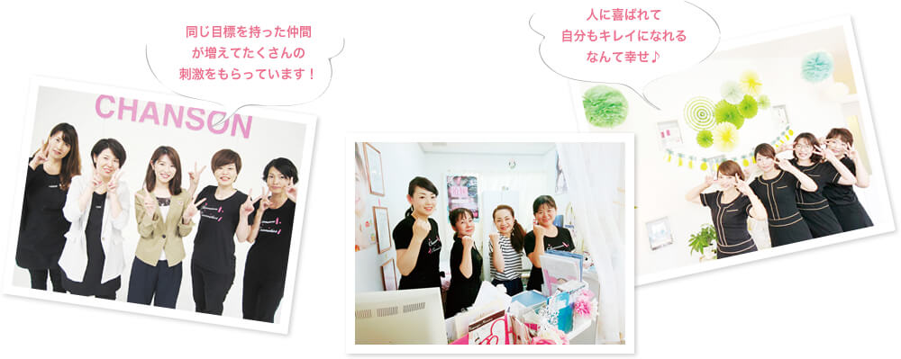 シャンソンのエステサロンでは、未経験者がイチから学べる研修制度をご用意しています。技術はもちろん、カウンセリングに必要な基礎知識などを学べる環境が整っています。